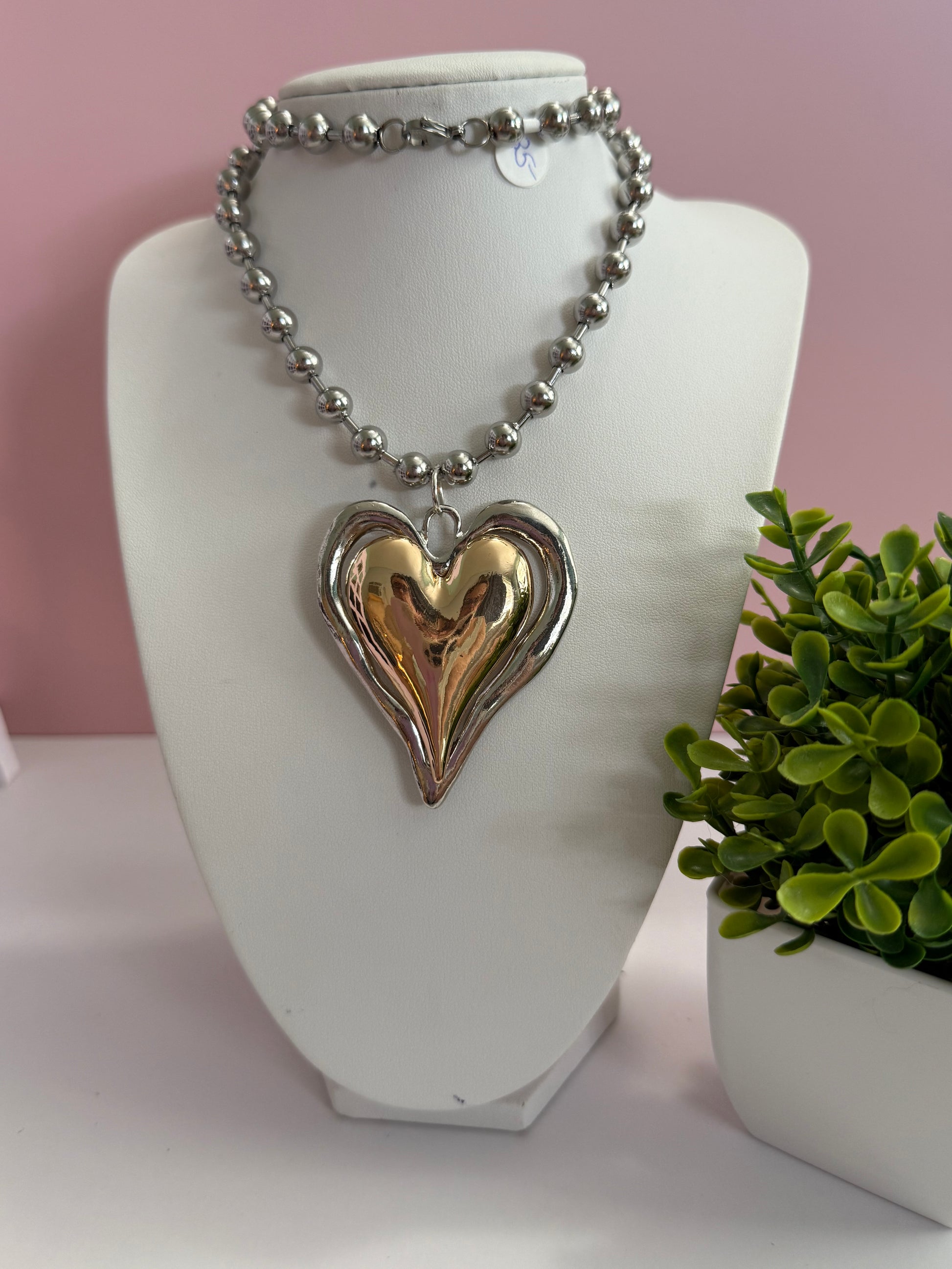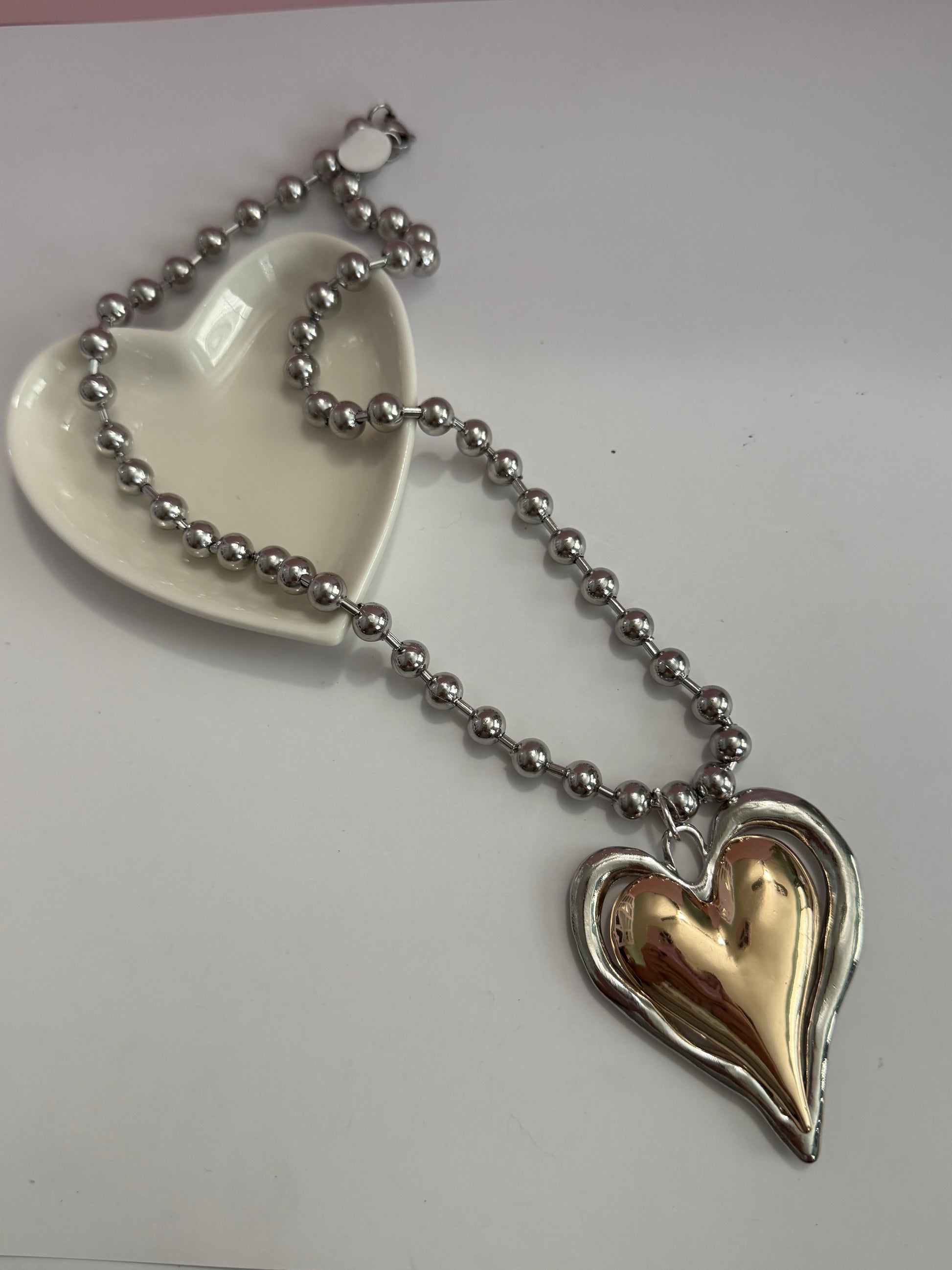 This 22” chain necklace is a stunning statement piece! The military-style stainless steel chain with its beaded design gives it a bold, industrial feel, while the double heart pendant in two-tone silver and gold adds a touch of elegance and warmth. The contrast between the cool steel and the soft curves of the heart creates a perfect balance of strength and romance.