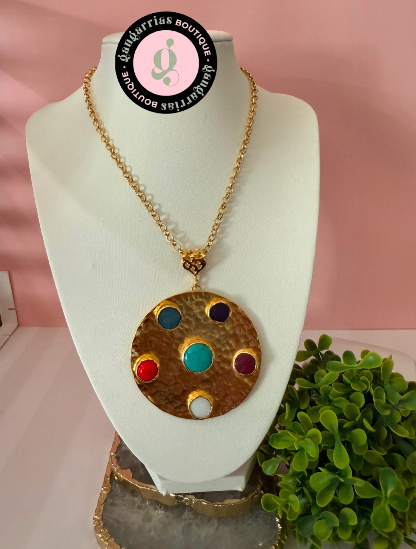 This striking Turkish-inspired 20” necklace features a bold, hammered aluminum pendant with an elegant round shape, reminiscent of ancient medallions. Embedded with vibrant color-crystals, each gemstone-like accent adds depth and a regal touch to the design. The lightweight yet statement-worthy chain enhances its luxurious aesthetic, making it perfect for those who love bold, artistic jewelry with cultural influences. A true statement piece that embodies heritage, craftsmanship, and modern elegance.